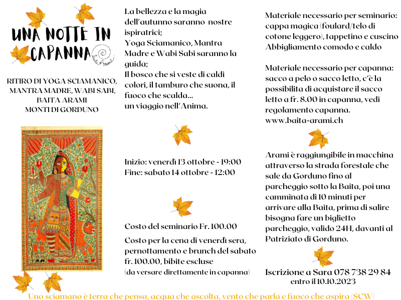 Faremo rituali ispirati dallo Yoga sciamanico, dal Mantra Madre, dal Wabi Sabi. Cucineremo assieme il nostro cibo. Danzeremo sotto le stelle. Respireremo con gli avi che prima di noi hanno vissuto la montagna e i suoi animali. Flyer di presentazione.